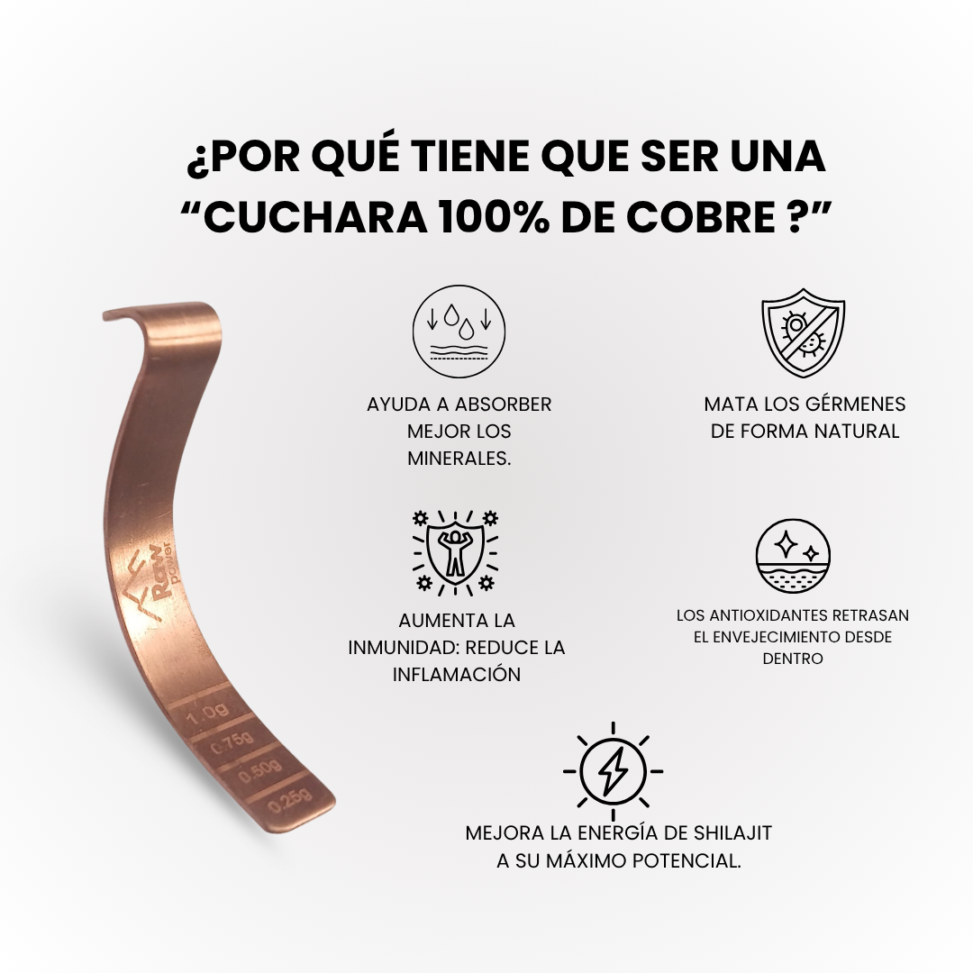 Una cuchara de cobre real para medir tu dosis diaria de Shilajit con precisión y mantener la resina pura.